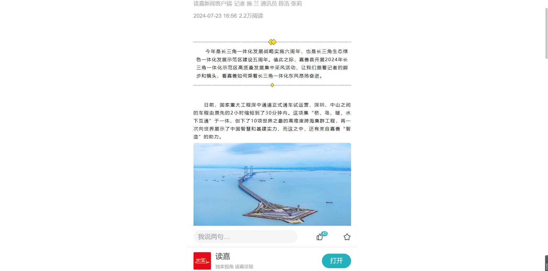 今年是長(zhǎng)三角一體化發(fā)展戰(zhàn)略實(shí)施六周年,也是長(zhǎng)三角生態(tài)綠色一體化發(fā)展示范區(qū)建設(shè)五周年。值此之際,嘉善縣開(kāi)展2024年長(zhǎng)三角一體化示范區(qū)高質(zhì)量發(fā)展集中采風(fēng)活動(dòng),讓我們跟著記者的腳步和鏡頭,看嘉善如何乘著長(zhǎng)三角一體化東風(fēng)昂揚(yáng)奮進(jìn)。