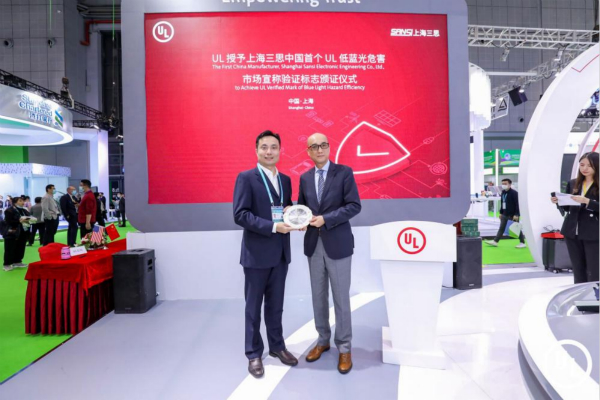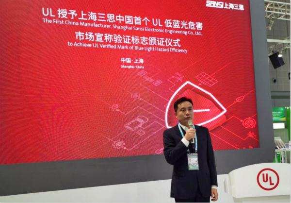 全球著名的安全性標(biāo)準(zhǔn)起草、制訂的第三方機(jī)構(gòu)——UL公司也亮相這一全球盛會(huì),并在此期間(11月6日下午)向上海三思電子工程有限公司(以下簡(jiǎn)稱上海三思)頒發(fā)了中國(guó)首個(gè)UL低藍(lán)光危害驗(yàn)證標(biāo)志證書。