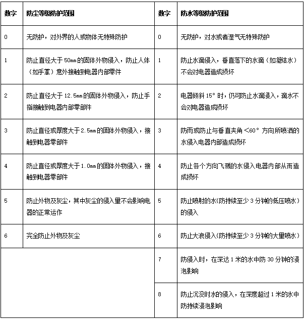 下面表格,簡(jiǎn)要標(biāo)明了IP防護(hù)等級(jí)標(biāo)準(zhǔn)。