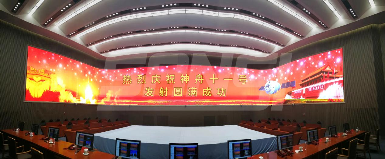這塊大屏(P1.47,200㎡)呈U字形安裝在控制中心大廳。2016年10月17日,神舟十一號(hào)載人飛船發(fā)射;同年11月9日,這塊高清屏高質(zhì)量地完成了全程顯示了國家領(lǐng)導(dǎo)人與神舟十一號(hào)航天員天地通話實(shí)況,向世人展示了中國航天事業(yè)的驕傲成果。