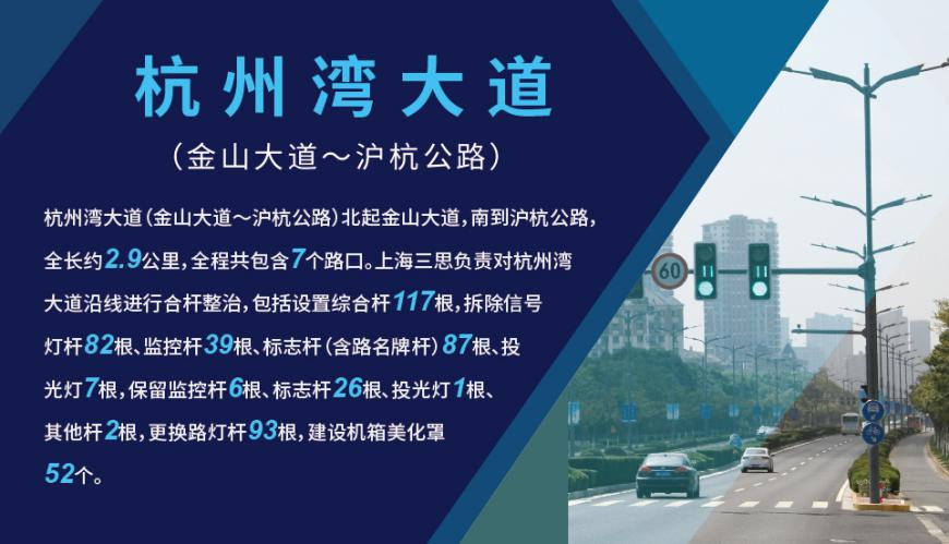 期間,上海三思積極配合金山政府進(jìn)行整改活動(dòng),實(shí)現(xiàn)對(duì)杭州灣大道(金山大道?滬杭公路)道路設(shè)施合桿整治,按照多桿合一、多箱合一的要求,對(duì)各類桿件、機(jī)箱、桿上設(shè)施、配套管線等進(jìn)行集約化設(shè)置,實(shí)現(xiàn)共建共享,互聯(lián)互通,多效一體化設(shè)計(jì),合桿率大于50%。
