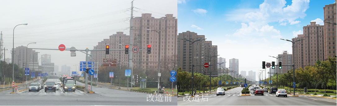 經(jīng)過(guò)各部門的共同努力,杭州灣大道上林立的各式路名牌、信號(hào)燈等桿件逐漸合并,煥然一新,達(dá)到了“線清、桿合、景美”的效果。