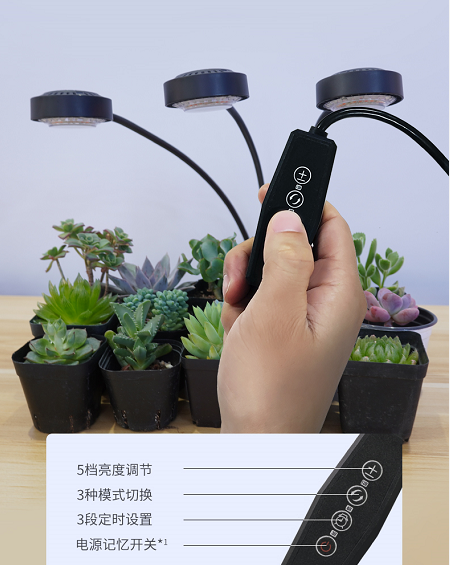 通過線上控制器,燈亮狀態(tài)下,短按分別開啟 3/6/12 小時倒計(jì)時,當(dāng)?shù)褂?jì)時結(jié)束后,燈具將自動關(guān)閉,出門忘記關(guān)燈再也不怕不怕了;不管家里種的是喜陽植物,還是喜陰植物,通過5檔亮度調(diào)節(jié),可以選擇合適光照;通過3種模式靈活切換,植物苗期、生長期、開花期、結(jié)果期不同光照需求,一盞燈就可以輕松搞定;想要打開之后的燈保持關(guān)閉前的亮燈狀態(tài),通過電源記憶開關(guān)就可以實(shí)現(xiàn)啦,同時每按電源記憶開關(guān)一次即可關(guān)閉一個燈,按鍵3次后,3個燈全部關(guān)閉。