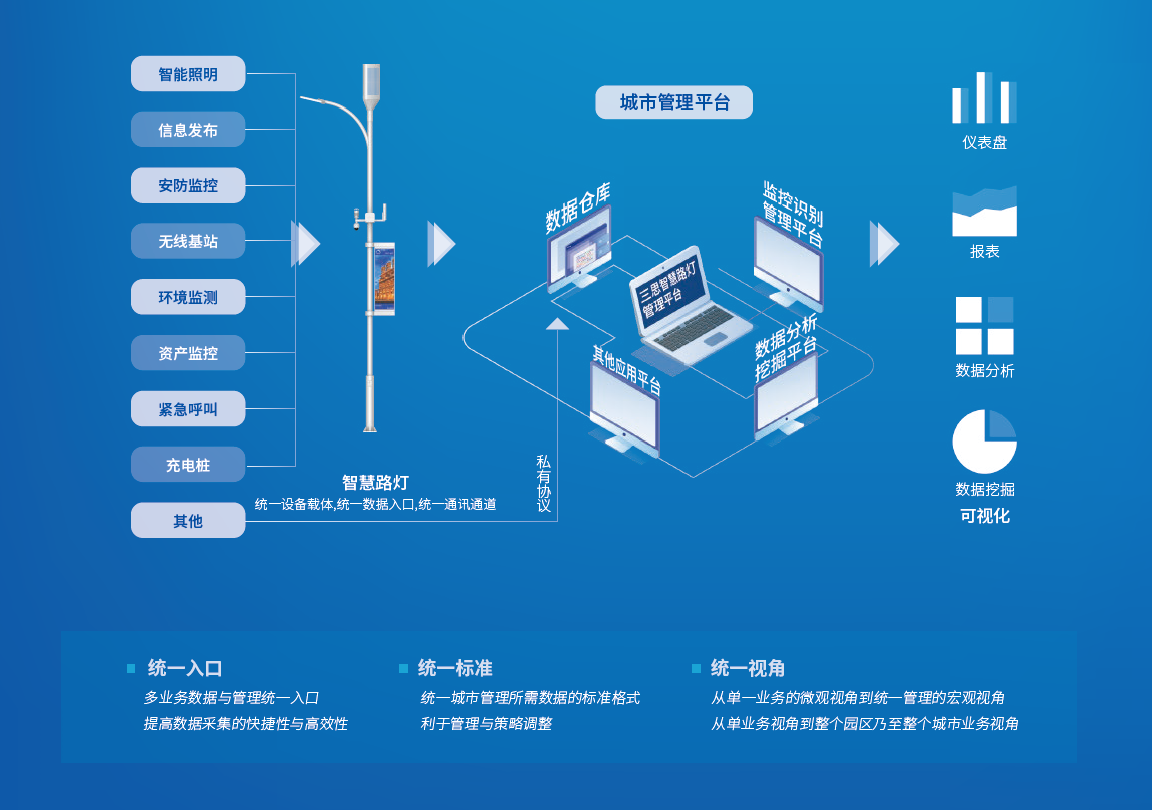 城市的精細(xì)化管理需要大量的數(shù)據(jù)依托,智慧路燈及燈桿系統(tǒng)利用其分布在城市各個(gè)道路的密集型特點(diǎn),可以實(shí)時(shí)收集和發(fā)布各項(xiàng)城市信息。通過(guò)對(duì)于數(shù)據(jù)及信息的收集和分析,為城市精細(xì)化管理提供重要的數(shù)據(jù)支撐,給城市建設(shè)者,管理者提供大量實(shí)效信息。