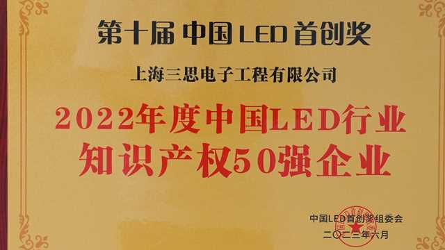“LED首創(chuàng)獎”創(chuàng)立于2014年,是為表彰在中國LED行業(yè)做出突出貢獻的企業(yè)和個人而設(shè)立的年度獎項,堪稱LED行業(yè)的“奧斯卡頒獎”。本屆中國LED首創(chuàng)獎共收到幾百家企業(yè)的參評資料,競爭激烈,經(jīng)過組委會,專家評審委員對申報企業(yè)的公平,公正的嚴格篩選,上海三思榮獲“2022年度中國LED行業(yè)知識產(chǎn)權(quán)50強企業(yè)”稱號。