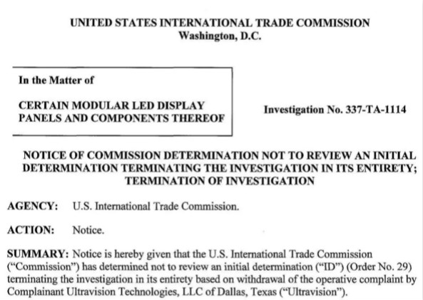 美國時間2月21日,美國國際貿(mào)易委員會(ITC)正式下達(dá)決定:不復(fù)議ITC法官的初步裁決,始于2018年3月27日美國公司針對中國LED顯示屏企業(yè)發(fā)起的專利侵權(quán)案,原告現(xiàn)無條件撤訴!令人關(guān)注的LED顯示屏337案件正式結(jié)束調(diào)查。