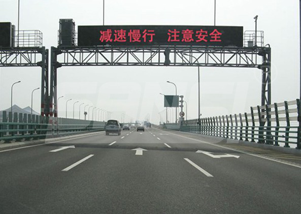 LED可變信息標(biāo)志不僅可清晰準(zhǔn)確地播出文字及圖形內(nèi)容 ,還有著視距遠(yuǎn)、視角廣、亮度高、顯示內(nèi)容靈活、壽命長(zhǎng)等優(yōu)點(diǎn)。同時(shí),它被安裝且長(zhǎng)期工作于高速公路一類戶外嚴(yán)酷環(huán)境,對(duì)耐候性、防護(hù)性能、材料性能等有著頗為嚴(yán)格的要求。其信息發(fā)布系統(tǒng)的主要由——顯示機(jī)箱模組、配電系統(tǒng)、控制系統(tǒng)、傳感系統(tǒng)、信號(hào)傳輸系統(tǒng)組成。
