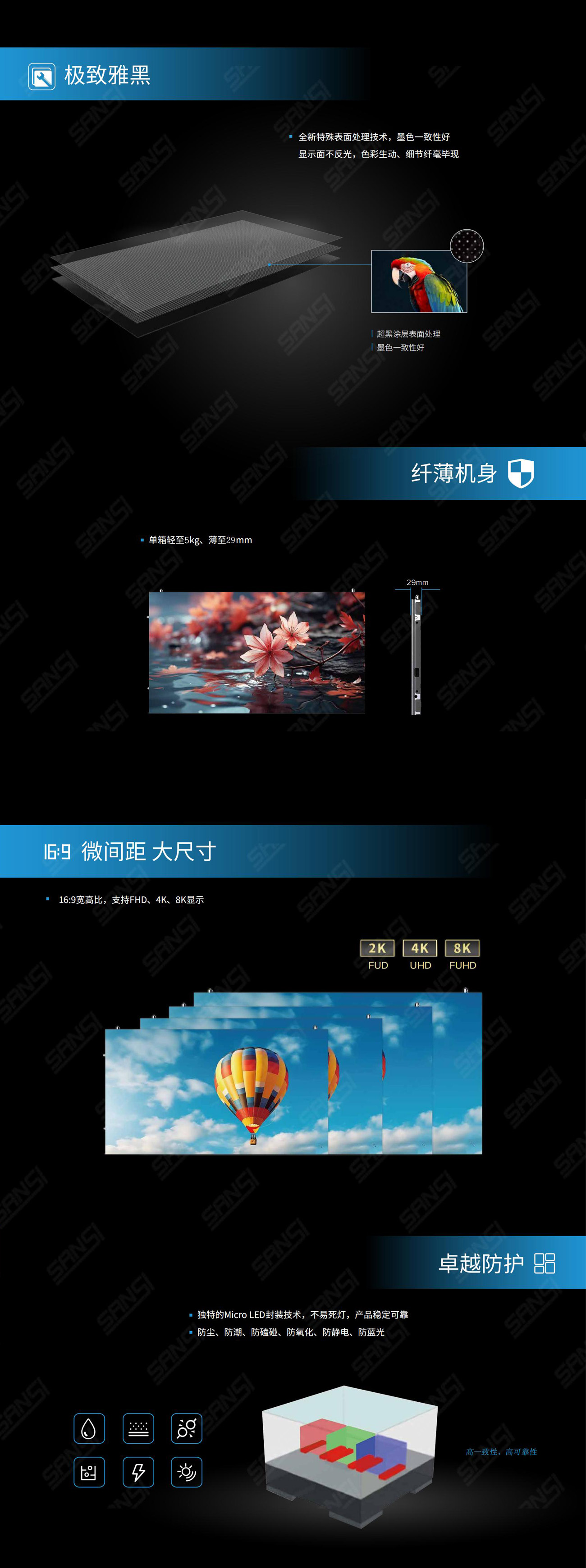 VEⅢ MCOB是一款優(yōu)秀的COB微間距顯示產(chǎn)品。16:9寬高比,600mm的機身寬度,具有卓越的顯示性能。超高解析度,響應速度快,色域覆蓋廣。具有防水、防潮、防塵、防氧化、防撞、方便清潔等特點,十分適合博物館、展覽展示、高端展廳等需要逼真圖像的專業(yè)領(lǐng)域。