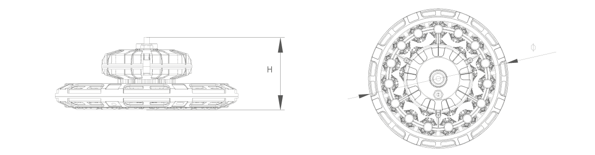 C2300-BE-180W/200W 176 ~ 264 VAC 50/60Hz ≥ 80 30º/60º/90º/120º PC + 陶瓷像素 掛鉤 / 吊桿 / 吊鏈 常亮/DALI/0-10V Φ341*H134mm 約3.44KG