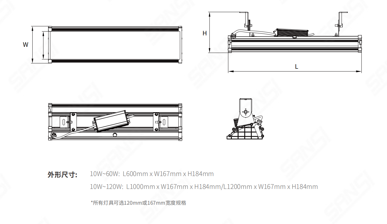 • 整燈外殼采用一體鋁壓鑄,質(zhì)量輕,散熱好,且有足夠的強度